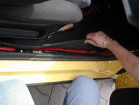Démontez la boîte à gants (les vis sont à l'intérieur) et passez le câble par là. Démontez les bas-de-porte et le cache avant-droit, faites descendre le câble le long de la portière puis passez sous la banquette arrière pour déboucher dans le coffre.